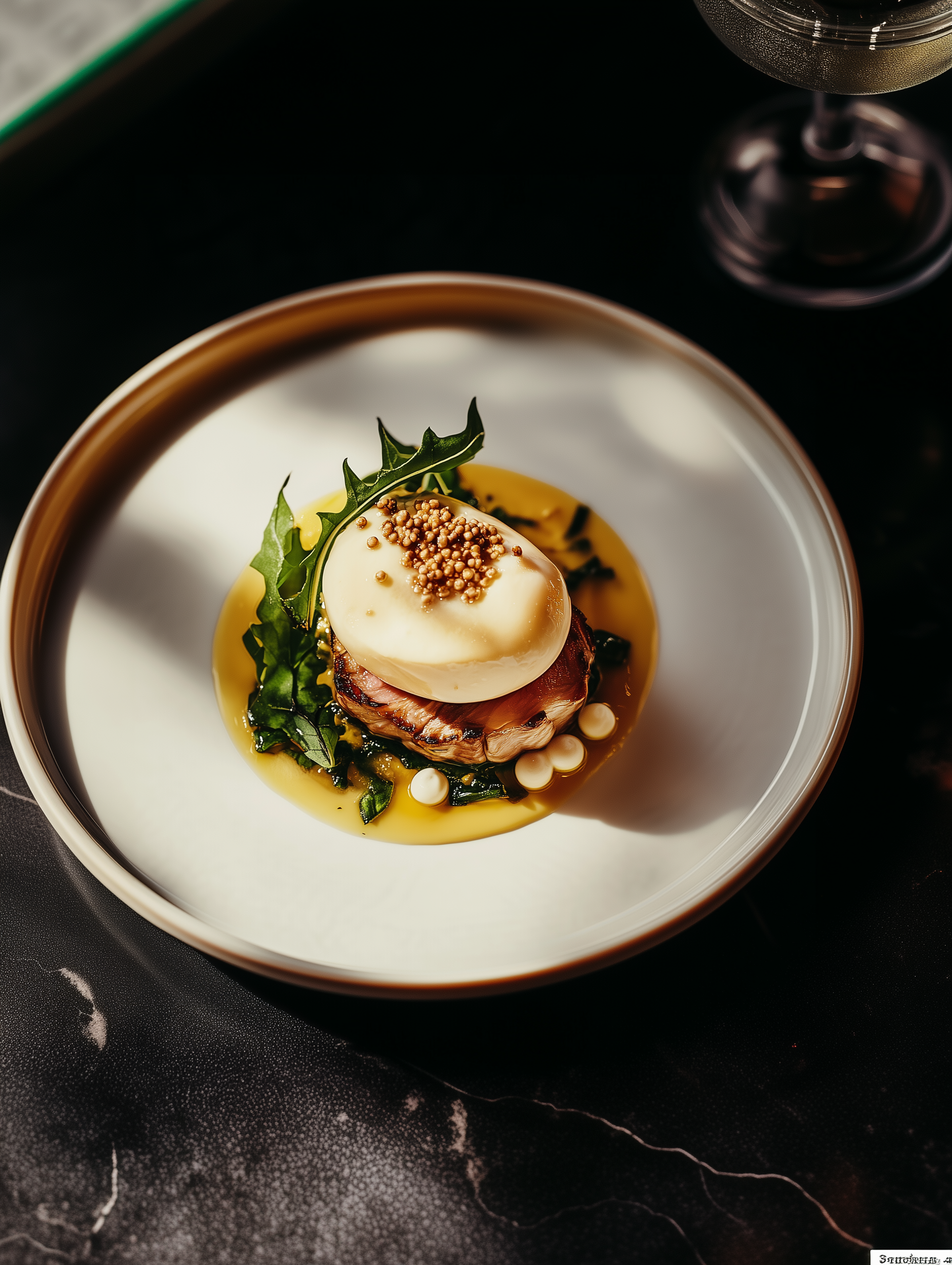 Tender pork fillet served on a velvety cauliflower cream, finished with a hint of herb oil.